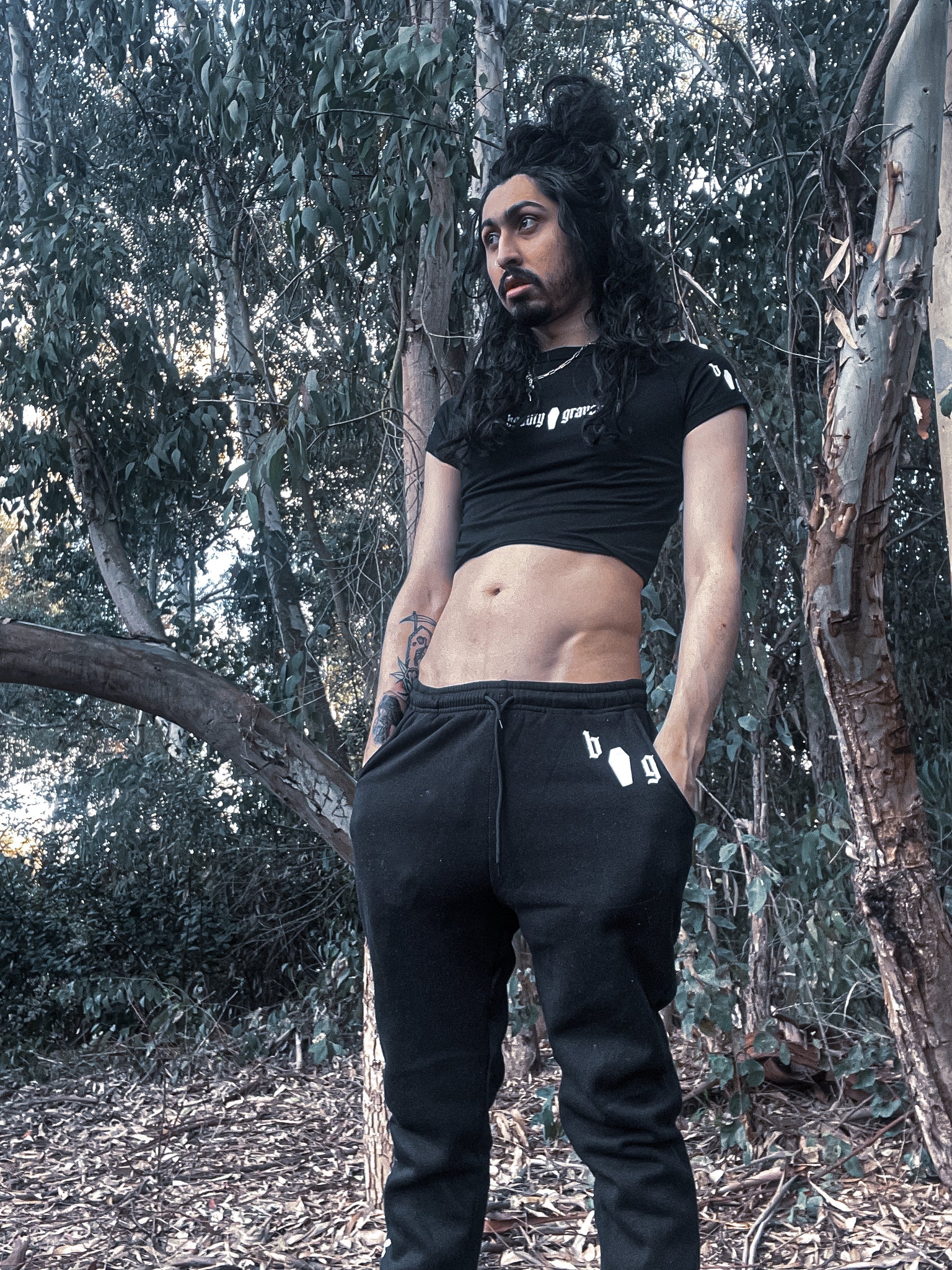 B&G black joggers, model is wearing a Medium. Sizes run small, hand wash and air dry only.